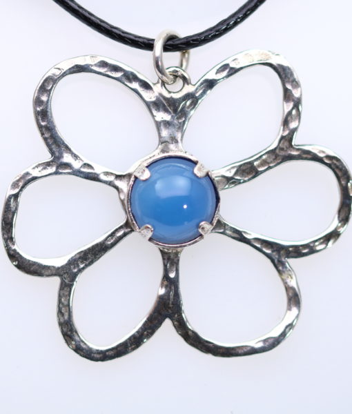Χειροποίητο μενταγιόν από ασήμι 925˚ σφυρήλατο σε σχήμα λουλουδιού, με πέτρα μπλε αχάτη (μήκος 4,0εκ.)