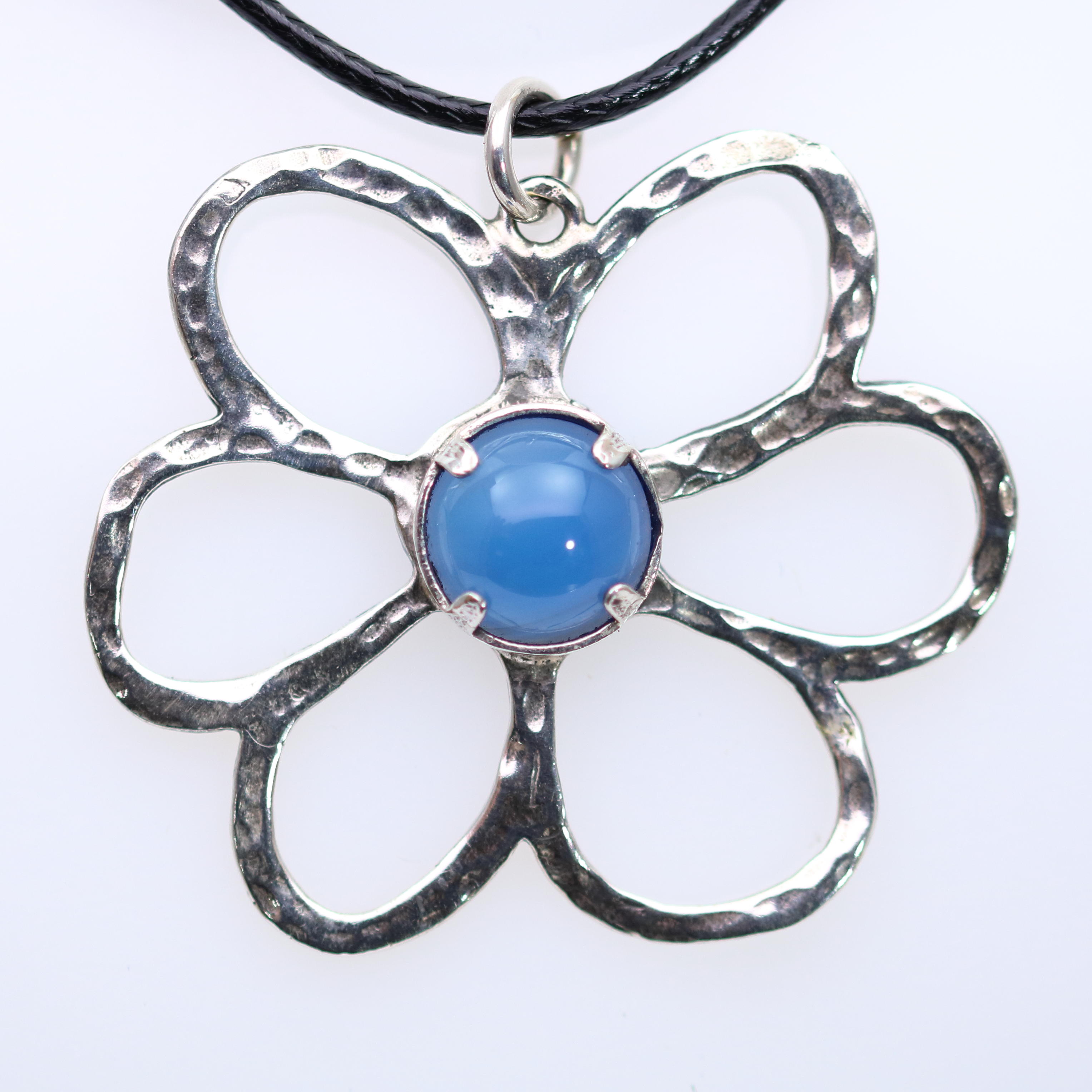 Χειροποίητο μενταγιόν από ασήμι 925˚ σφυρήλατο σε σχήμα λουλουδιού, με πέτρα μπλε αχάτη