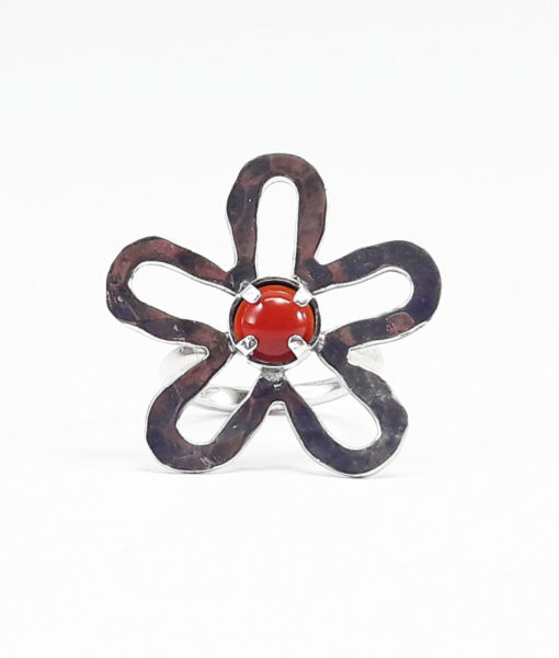 Χειροποίητο δαχτυλίδι από ασήμι 925˚ σε σχήμα λουλούδι, σφυρήλατο με πέτρα κορνεόλη (Νο 53)